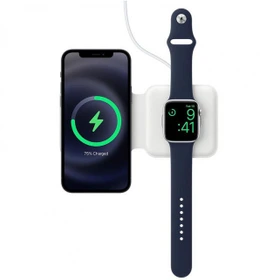 شارژر بی سیم اپل مدل MagSafe Duo یک شارژر دو کاره است که برای شارژ گوشی آیفون و اپل واچ طراحی شده است. این شارژر دو حالت شارژ را پشتیبانی می کند: شارژ بی سیم و شارژ با سیم. با استفاده از مغناطیس قوی MagSafe، این شارژر به طور ایمن به دستگاه های شما متصل می شود و شارژ را آغاز می کند. همچنین با داشتن طراحی قابل حمل و جمع و جور، می توانید آن را به راحتی به همراه خود ببرید و همیشه دسترسی به شارژ برق داشته باشید.